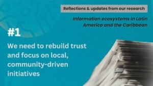 On October 26, we gathered online with over 20 organisers, activists and journalists from 9 countries in Latin America. We were inspired to hear from speakers Nathaly Espitia (Nois Radio-Internews) and Maria Juliana (Universidad Icesi, Cali. Colombia) from Colectivo Noís Radio, Júlia Rocha from Artigo 19, and Ramiro Alvarez Ugarte from CELE, as well as from participants in the call, who joined us in an open discussion about challenges we’re facing in the information ecosystem in the region and opportunities we see for action. In this blog post we’re sharing some of the key takeaways from our conversation.